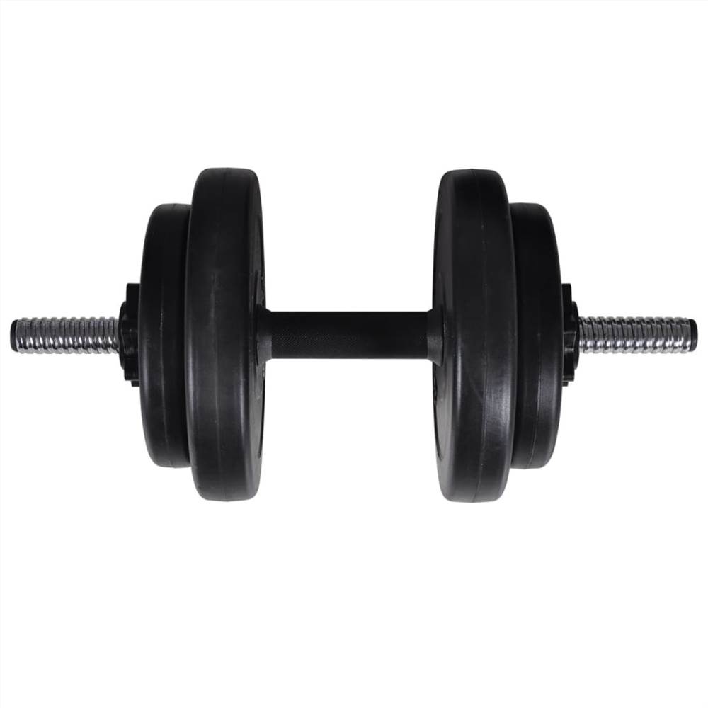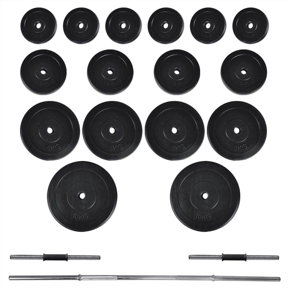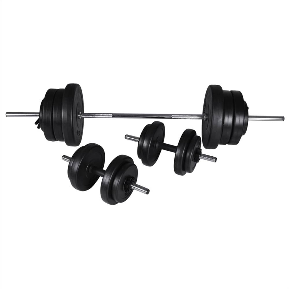 This set of ergonomically designed barbell/dumbbell set will allow you to perform a large range of exercises more easily and safely at home or in the gym. The set includes 1 barbell, 2 dumbbells, and 16 weight discs. The barbell/dumbbell set features solid chrome-plated bars with quick-action spring collars (barbell bar), non-slip grips, and fluted star-screw caps (dumb bell bar) for secure attachment of the weight discs. You can work out without worrying about safety issues. The weight discs are made with a robust PE casing. They can be combined in various ways for different training purposes. Delivery includes 1x barbell bar, 2x dumbbell bars, 6x 1.25 kg weight discs, 4x 2.5 kg weight discs, 4x 5 kg weight discs, 2x 10 kg weight discs, and 6x caps.