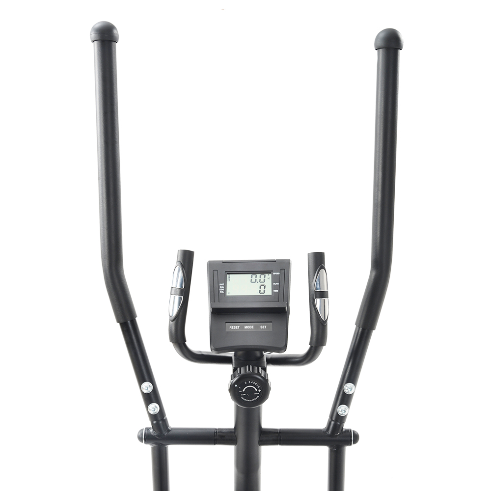 Our streamlined design cross trainer is equipped with a digital LCD display to monitor the data of speed, time, calories, total distance, and heart rate during the sports. This cross trainer has two handles and the handle next to the electronic meter can test the user’s heart rate to help control the body condition in the exercise.