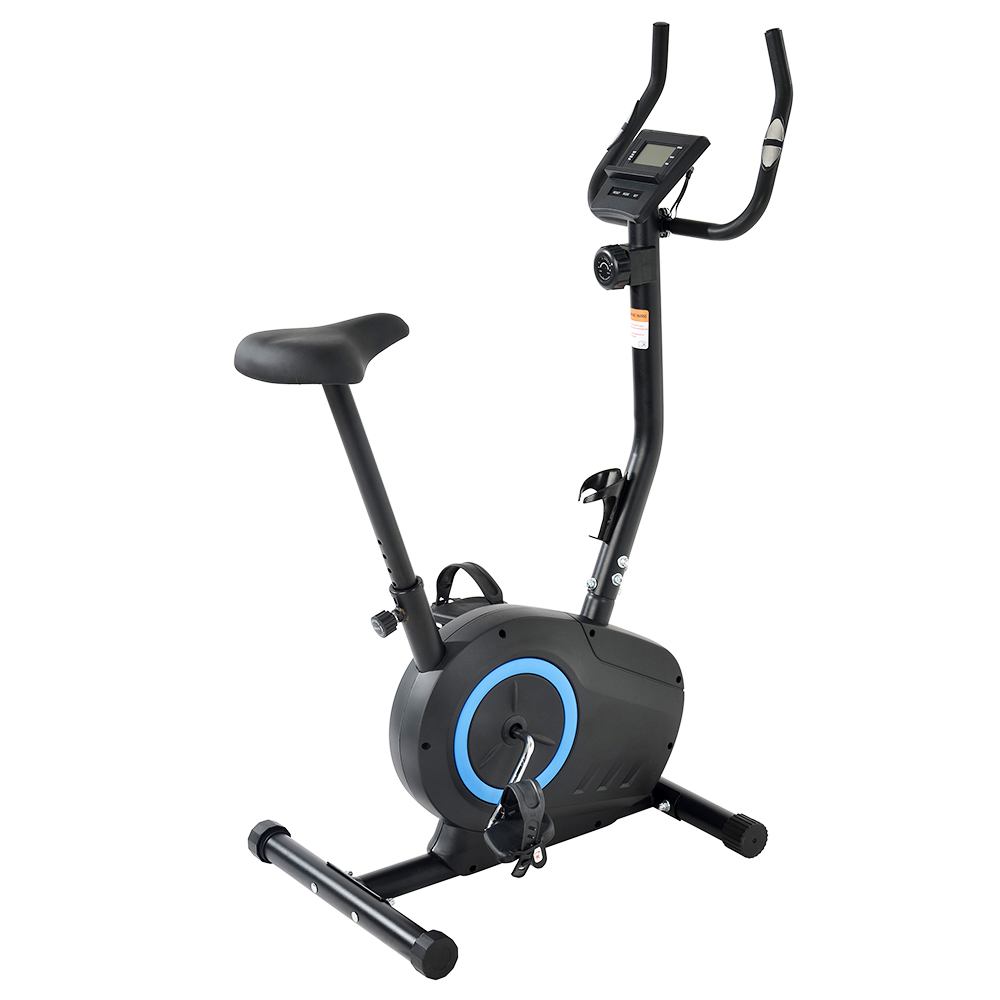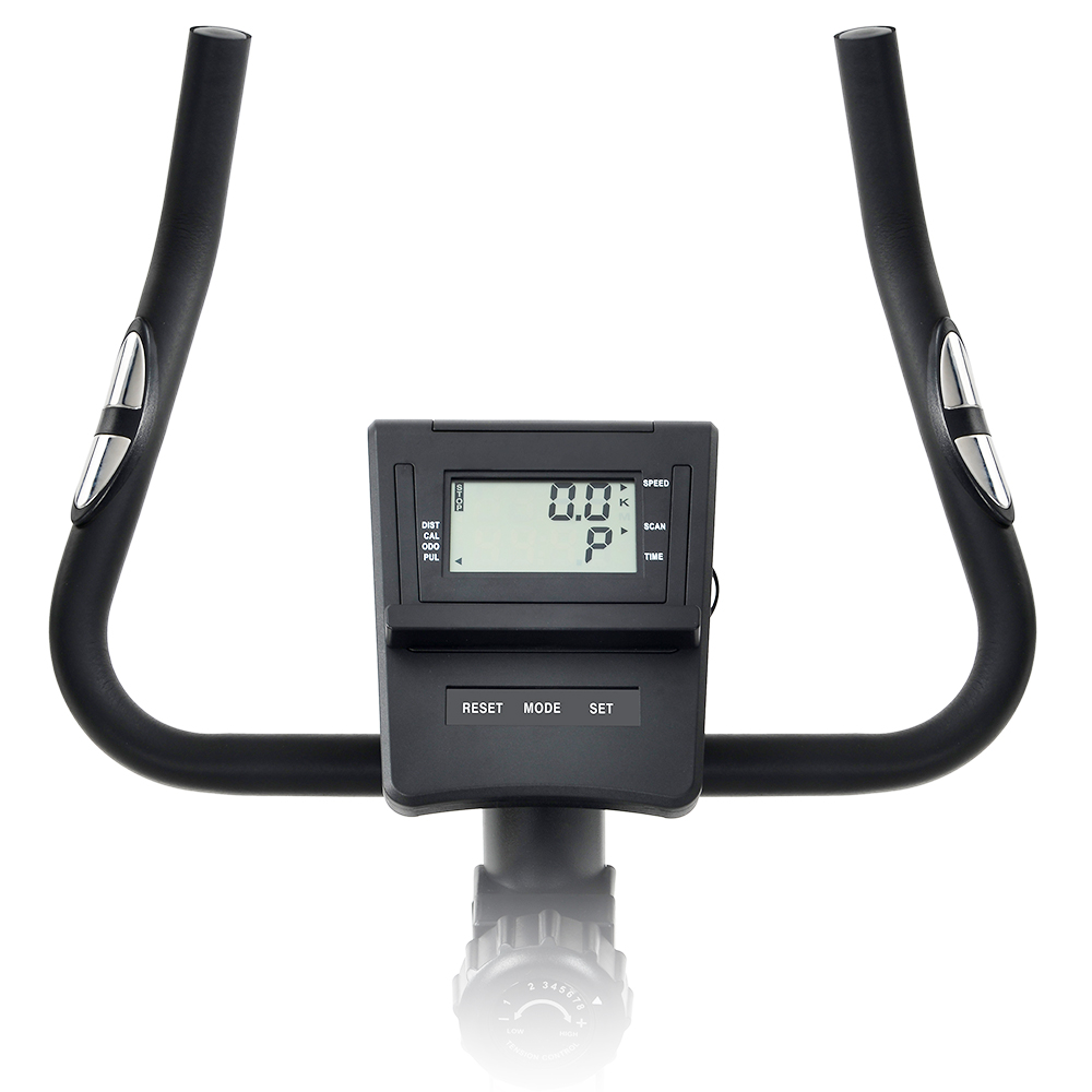 This modern design fitness bike is equipped with a digital LCD display to monitor multiple data of your body during the sports, such as speed, time, calories, total distance, and heart rate. And the two handles can test the heart rate via the button for the user as well. In addition, the weight of the flywheel is 3.5kg and is equipped with magnetic resistance, which makes the flywheel belt moves in both directions.