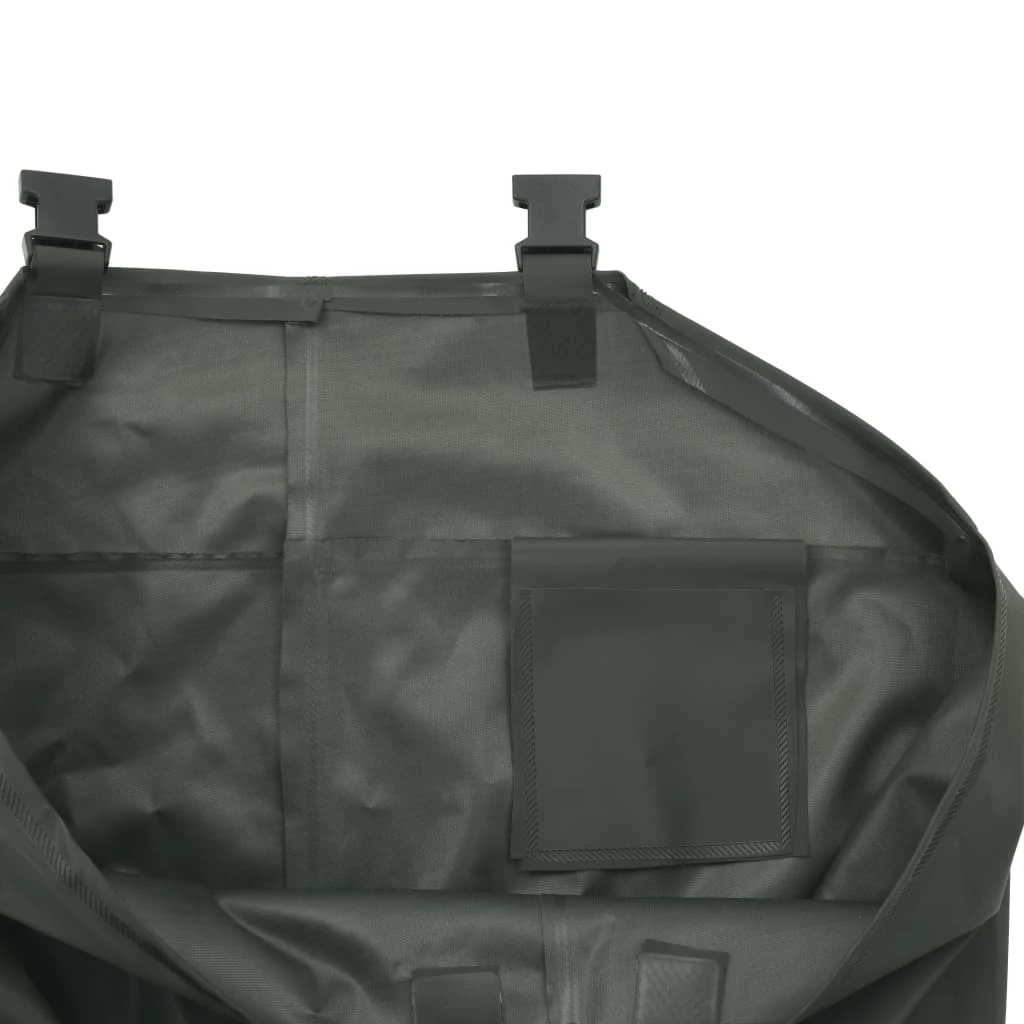 Stay dry while fishing with our chest wader pants. This exceptional coated polyester fabric is cozy and pliable inside, and simultaneously robust outside. Thanks to its stitched and sealed seams, as well as the attached boots, our wading pants are 100% waterproof. Additionally, the shoulder straps enable you to make the fishing pant fit perfectly without a hitch.